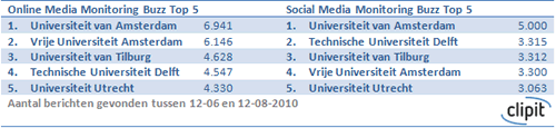Met bijna 7.000 gevonden berichten in de meetperiode, staat de Universiteit van Amsterdam op 1 in de Online Media Monitoring Buzz Top 5. Ook wat betreft social media en specifiek op nieuwssites is deze universiteit het grootst. Dit is te verklaren door het grote aantal onderzoeken dat de universiteit publiceert. Tevens worden hoogleraren en andere vertegenwoordigers door media vaak als expert gevraagd bij allerlei kwesties.De Technische Universiteit Delft staat op de tweede plaats in de Social Media Monitoring Buzz Top 5, veroorzaakt door de schade die een vluchtende verdachte toebracht aan de solarboot van de universiteit. De gebeurtenis zorgde naast veel verontwaardigde reacties op Twitter, Hyves en Facebook ook voor een stroom aan berichten op nieuwssites.